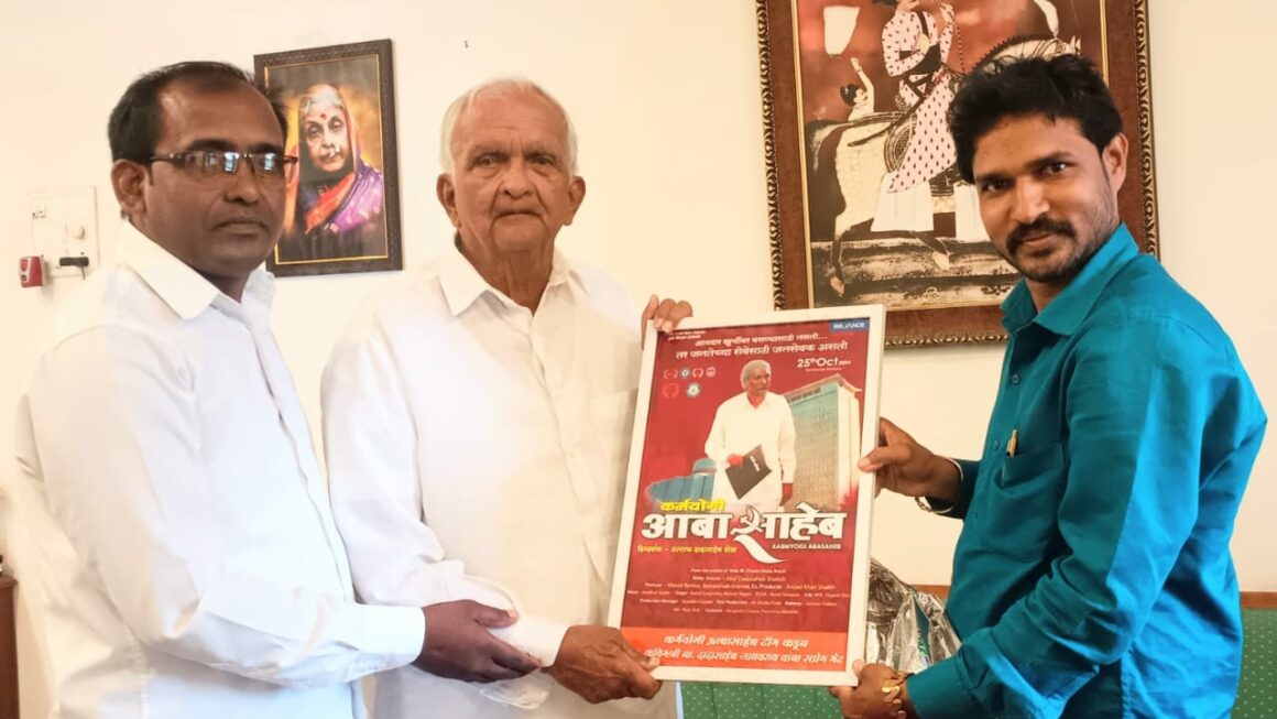 Pune, Correspondent: Son of Solapur district and writer, director Altaf Dadasaheb Shaikh. The poster of the film “Karmayogi Aaba Saheb”, based on the life of former Maharashtra cabinet minister V. Aaba Saheb and Ganpatrao Deshmukh, was inaugurated by Aaba Saheb’s then cabinet colleague and former agriculture minister Dadasaheb Jadhavrao. On this occasion, former agriculture minister Dadasaheb Jadhavrao was presented a poster frame of the film “Karmayogi Aaba Saheb” as a gift by the director, writer Altaf Dadasaheb Sheikh and Satyashodhak multipurpose social institution founder/president Vishal Bhende.