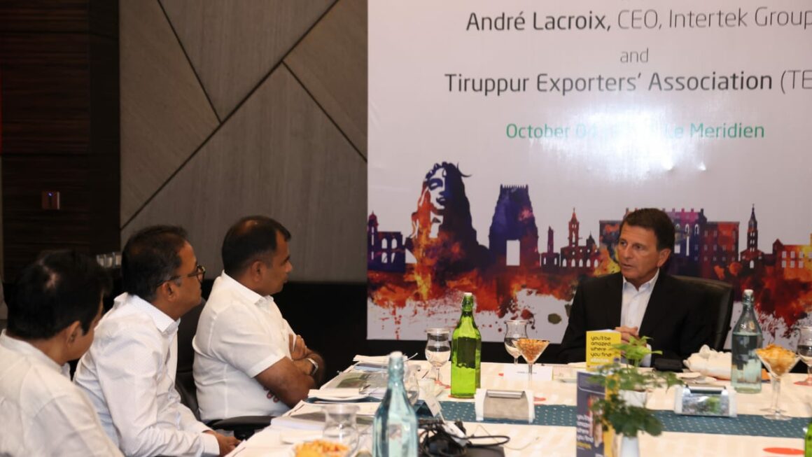 09 October 2023, Coimbatore: Intertek, a leading Total Quality Assurance provider to industries worldwide, has successfully conducted two illustrative events in India, in the presence of the Group CEO André Lacroix. Mr. André Lacroix visited Tiruppur, one of Asia’s biggest knitwear export hubs, on 4th October. The events were sustainability-oriented and attended by top industry stakeholders of the region’s textile and apparel industry. 55 km from Coimbatore, Tiruppur is home to 10,000 garment manufacturing units, of which the majority are MSMEs.